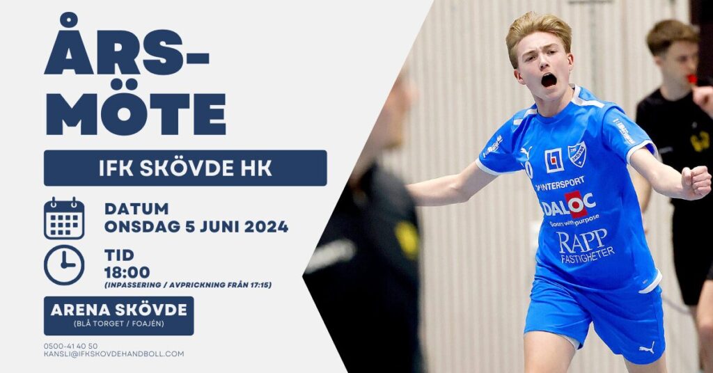 IFK Skövde HK bjuder in medlemmar till ordinarie årsmöte, onsdagen den 5 juni 2024 i Arena Skövde (Blå Torget/Foajén). Mötet börjar kl. 18:00, inpassering och avprickning på närvarolista sker från kl. 17:15.
